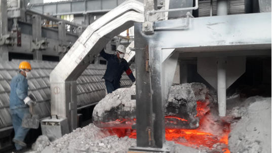 8月15日上午10點左右,在工投公司電解二車間,說起近期高溫天氣的作業情況,該車間三工段段長楊小明對筆者講,抓好班組人員的安全是第一位,對勞保品的穿戴更加嚴格。為了及時補充人員體力,工段在縮短作業時間、相互替換作業方面采取了措施。電解槽的維護要跟上,從塌殼、冒火到爐面整形等每項操作,不能因為高溫天氣而降低操作質量。此時,電解車間作業現場的環境溫度可達到三、四十攝氏度。當班的運行四班職工邢文壽正在向責任槽添加保溫料,筆者注意到他的臉上已沾滿了汗水。