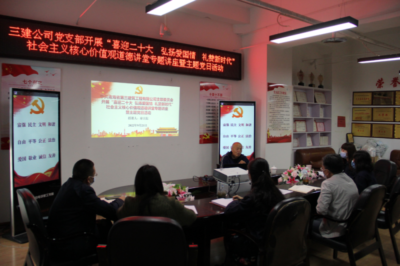 (省三建公司 訊 韓毓、王文杰/文 韓毓/攝 )2022年是黨的二十大召開之年,是落實省第十四次黨代會精神開局之年。為持續(xù)鞏固拓展黨史學習教育成果,加強精神文明建設(shè),深化民族團結(jié)進步宣傳教育和感恩教育,講好各族民族守望相助、團結(jié)奮進的國企故事,積極培育和踐行社會主義核心價值觀,9月21日,公司黨支部開展“喜迎二十大 弘揚愛國情 禮贊新時代”社會主義核心價值觀道德講堂專題講座暨主題黨日活動。