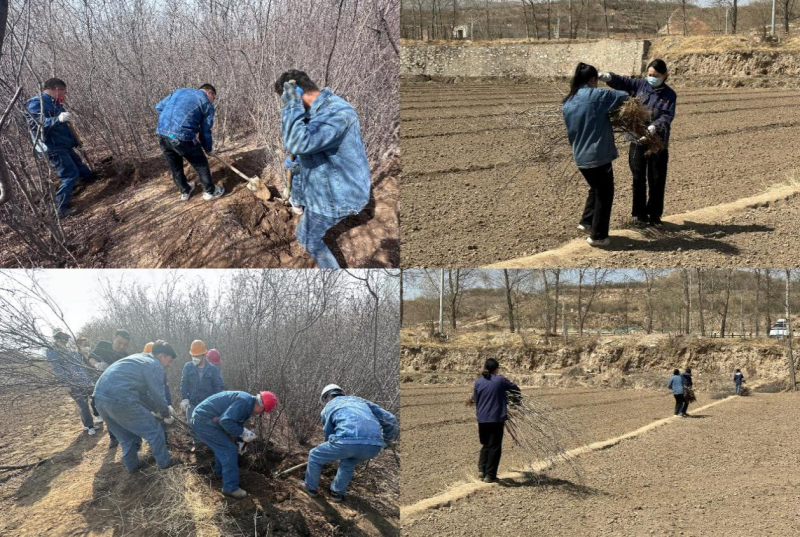 活動前期,公司領導班子成員根據物產北川工業物流園實際情況提前謀劃,多頻次與大通縣孫家寨村溝通,將該村“退林還田”亟待處置的桃樹和紫丁香樹等綠植資源整合接洽,并有規劃、有步驟地移栽回園區各處。