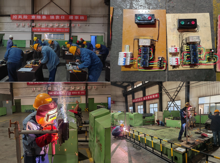 電工競賽現場,參賽選手面對繁瑣的配盤指導圖從容應對。剪線、剝線、壓接……,一招一式都是那么的嫻熟輕快,肅靜的環節里沖刺著“濃濃的火藥味”;而維修工比賽現場內卻異常熱鬧,新老電工、鉗工圍繞在設定的操作臺前,緊鑼密鼓地剪裁組料、焊接配件、清理焊渣、打磨表面,一套動作行云流水、一氣呵成。