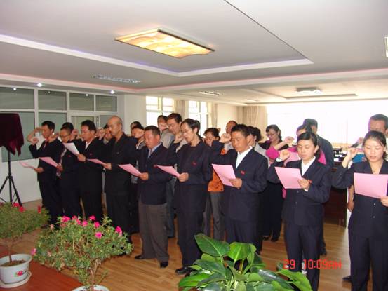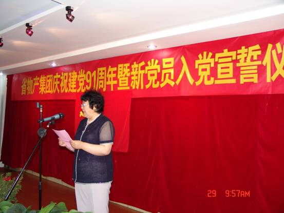 我宣誓:"我志愿加入中國共產黨,擁護黨的綱領,遵守黨的章程,履行黨員義務,執行黨的決定,嚴守黨的紀律,保守黨的秘密,對黨忠誠,積極工作,為共產主義奮斗終身,隨時準備為黨和人民犧牲一切,永不叛黨"。6月29日上午10∶00時,17名新加入黨組織的中國共產黨預備黨員、所屬各黨組織書記、老黨員代表等30余人的莊嚴宣誓,標志著青海物產系統慶祝建黨91周年系列活動正式展開。