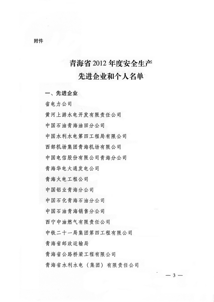 2012年,在省委、省政府的正確領導下,青海省物產集團總公司認真學習貫徹黨的十八大精神,全面貫徹落實科學發展觀,牢固樹立以人為本、安全發展的理念,深入開展"安全生產年"、"隱患排查治理"、"打非治違"等活動,為促進全省安全生產形勢持續穩定好轉做出了積極貢獻。為此,經省政府同意,省安全生產委員會決定授予青海省物產集團總公司"2012年度安全生產先進企業"榮譽稱號。